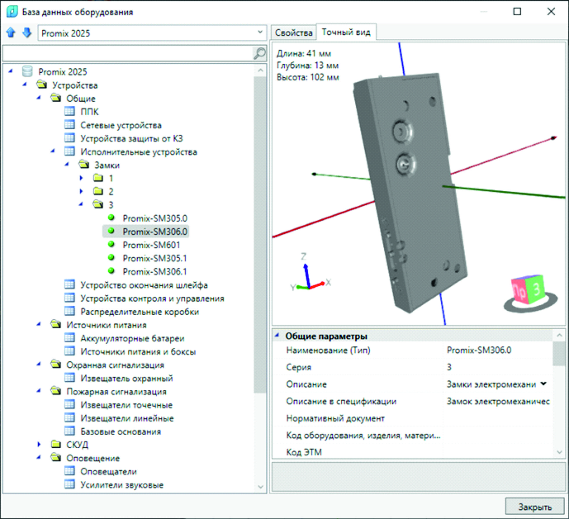 В базе данных представлены электромеханические замки Promix для систем контроля и управления доступом (СКУД). К каждому элементу оборудования в базе данных добавлено реалистичное 3D-представление, что позволяет использовать базу данных для создания 3D-модели проектируемой системы для технологии информационного моделирования (BIM/ТИМ).